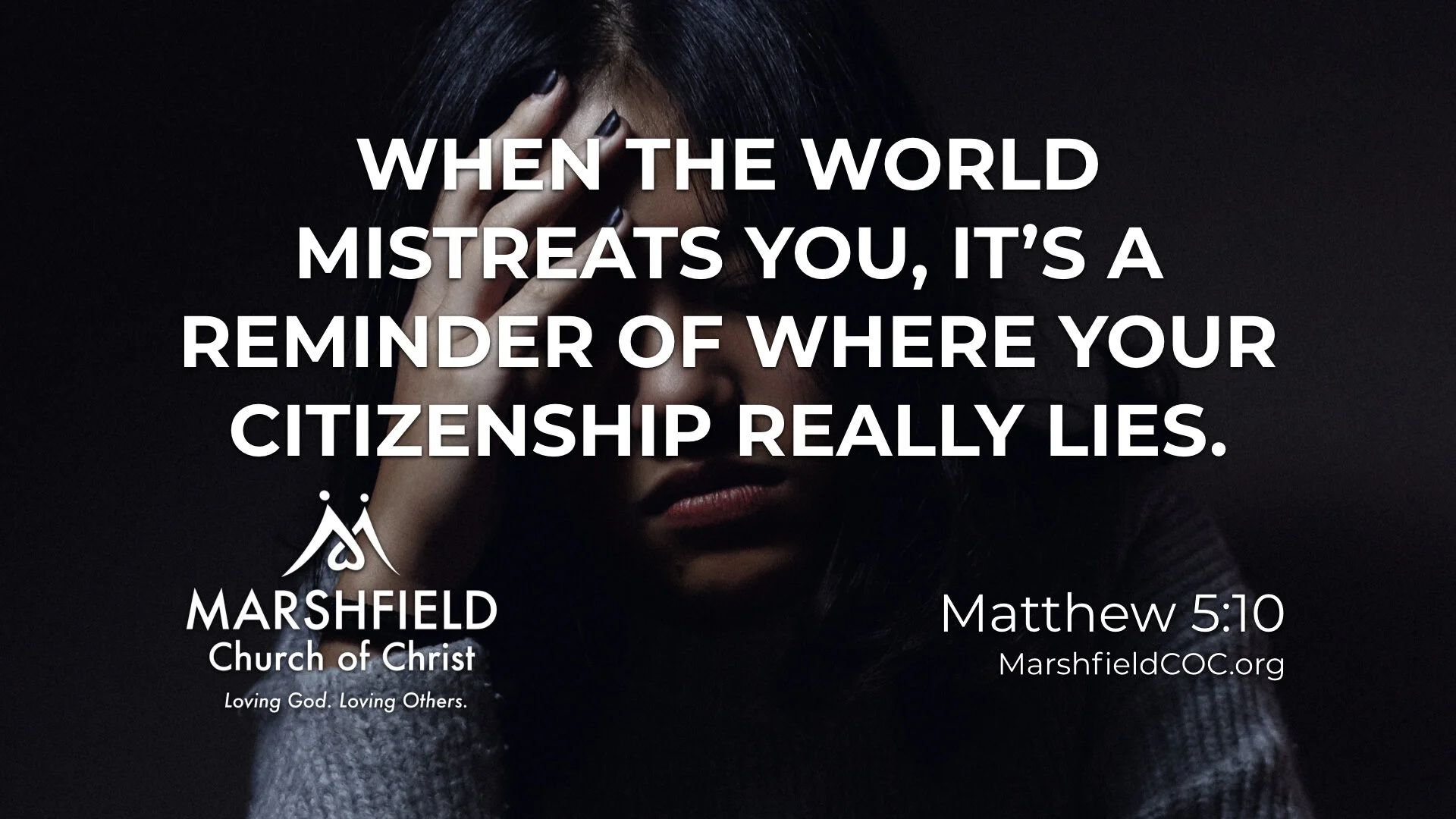 Devotional: When we face difficulty in life as a result of not fitting in with the rest of the world, Jesus calls us blessed. The world will mistreat those who are citizens of the kingdom. Do you do as Jesus says, and instead of looking at mistreatment from the world as a source of frustration and fear, do you look at it as a reminder of where your citizenship really lies—in heaven, not on earth?